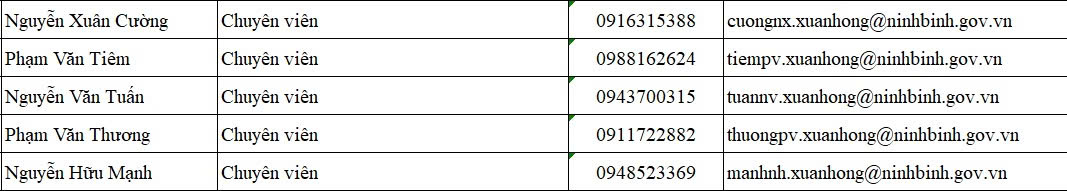 ![]() | Họ và tên: Nguyễn Trọng Huynh Chức vụ: Chánh Văn phòng HĐND-UBND Quê quán: xã Xuân Trường, tỉnh Ninh Bình Trình độ chuyên môn: Cử nhân Quản trị kinh doanh Trình độ Chính trị: Trung cấp Lĩnh vực được phân công phụ trách: Địa chỉ hộp thư công vụ: huynhnt.xuanhong@ninhbinh.gov.vn Số điện thoại liên hệ: 0815. 566. 366 |