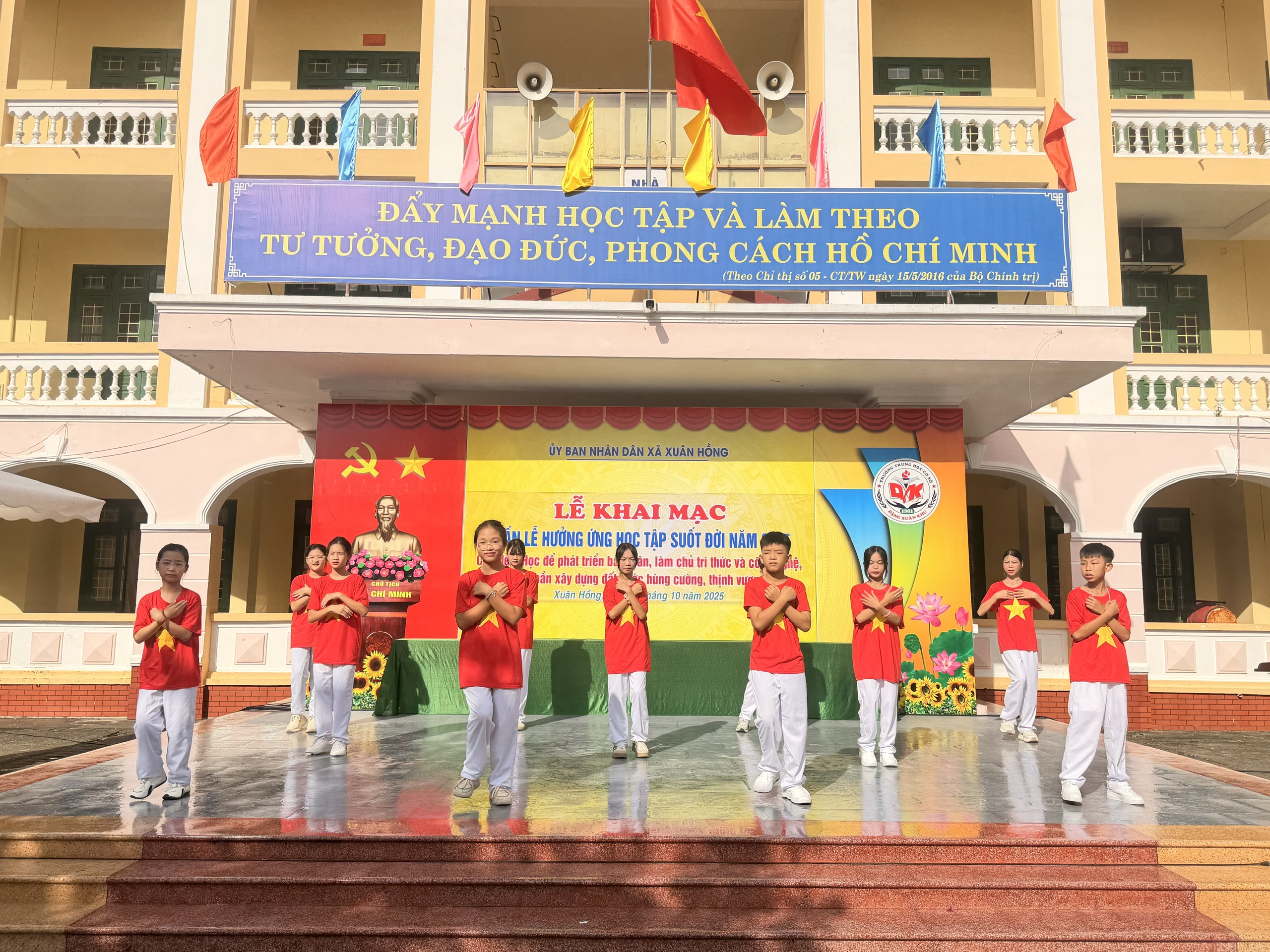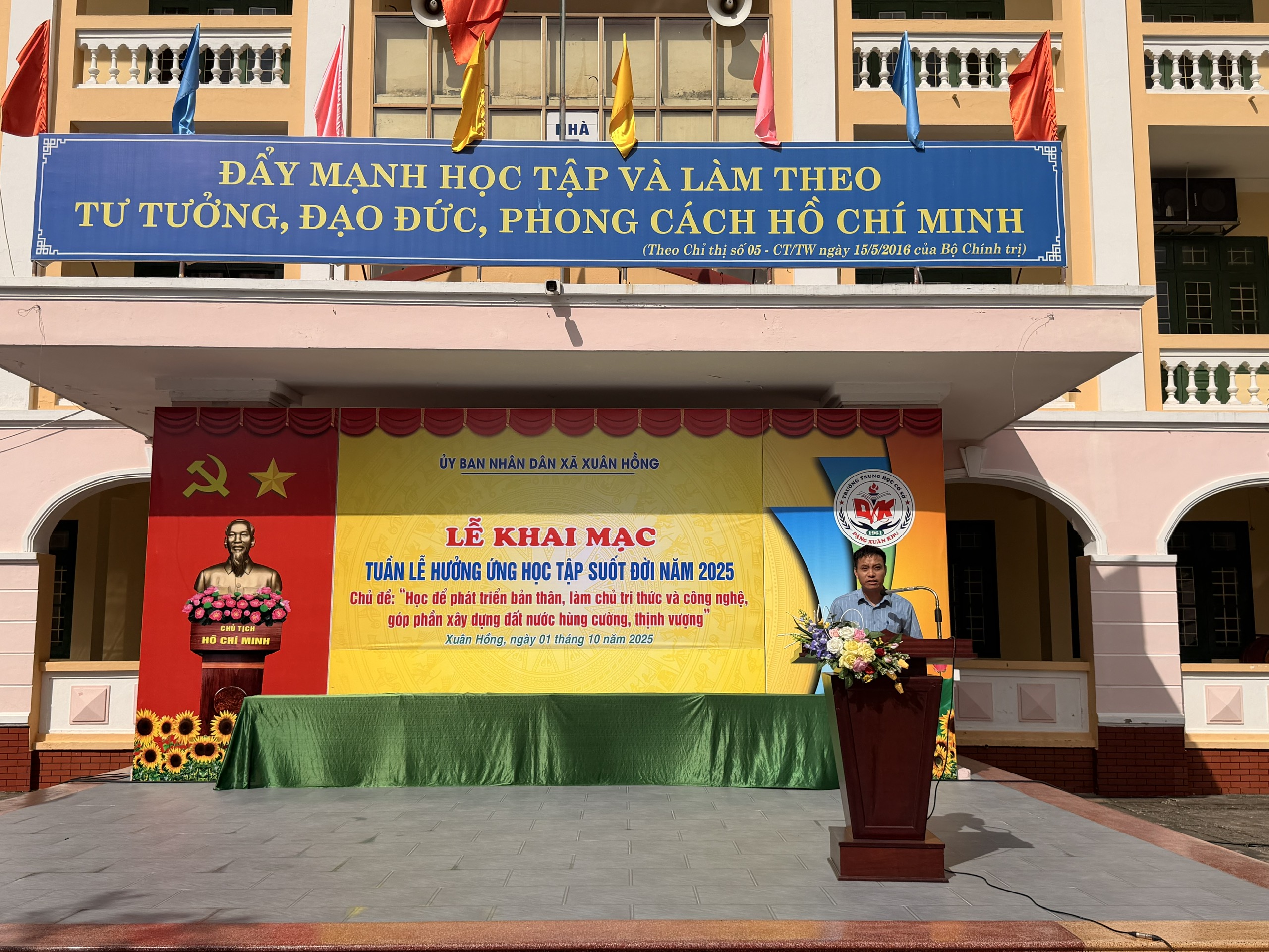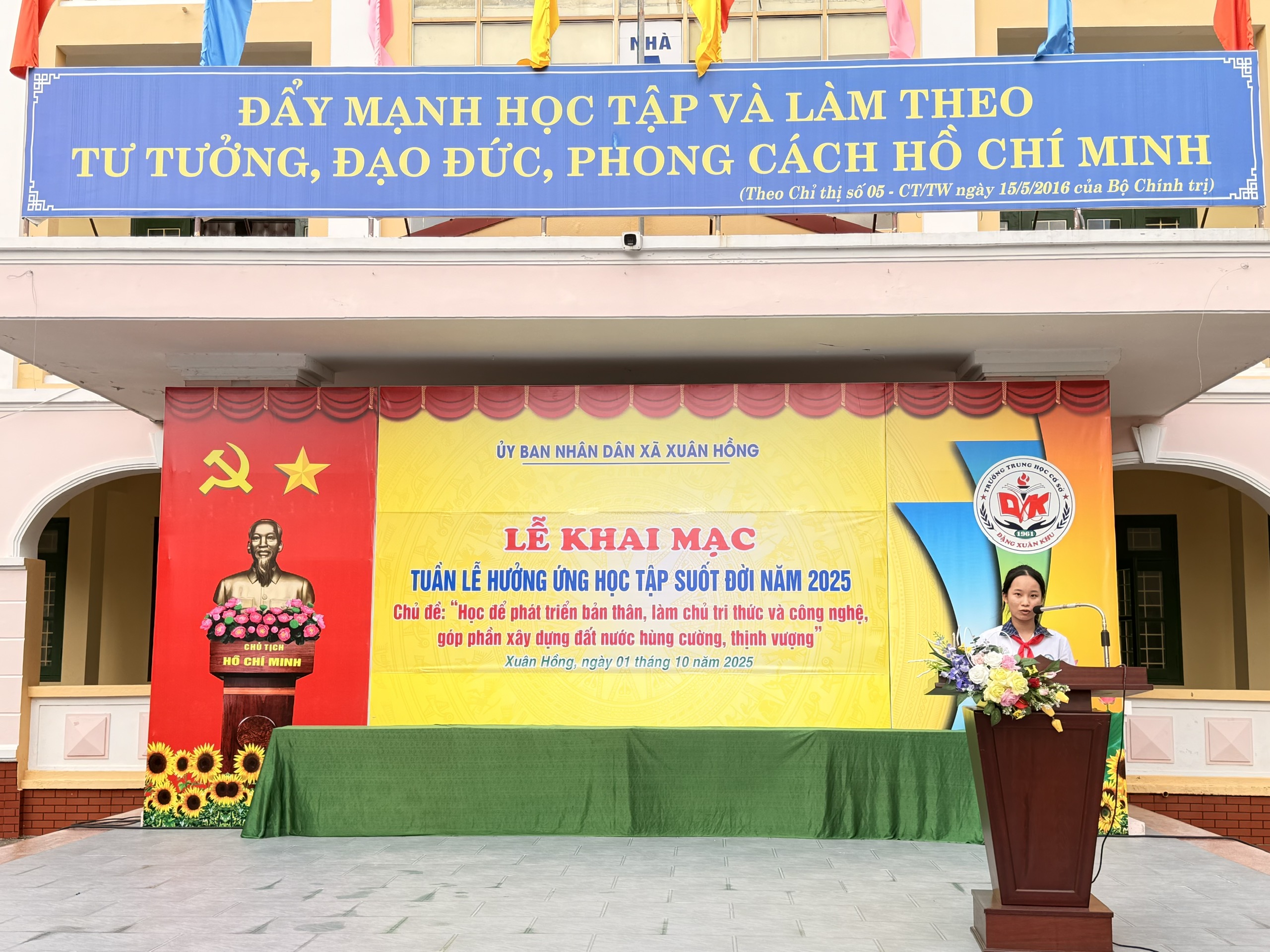 Sáng ngày 01/10/2025, tại Trường THCS Đặng Xuân Khu, UBND xã Xuân Hồng long trọng tổ chức Lễ khai mạc Tuần lễ hưởng ứng học tập suốt đời năm 2025 với chủ đề “Học để phát triển bản thân, làm chủ tri thức và công nghệ, góp phần xây dựng đất nước hùng cường, thịnh vượng”. Đây là một trong những sự kiện trọng tâm trong tháng 10, nhằm khẳng định tầm quan trọng của việc học tập thường xuyên, liên tục và suốt đời đối với mỗi người dân, đồng thời thể hiện quyết tâm của địa phương trong việc xây dựng “xã hội học tập” gắn với yêu cầu chuyển đổi số và hội nhập quốc tế.