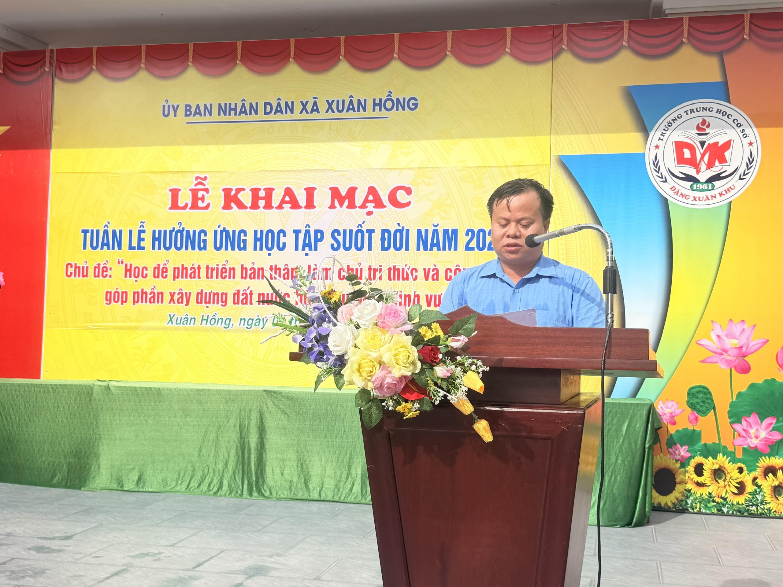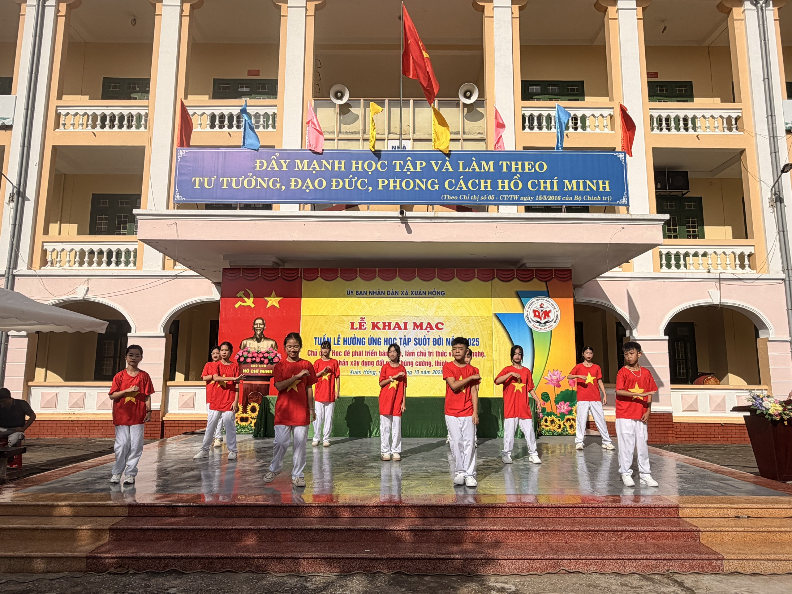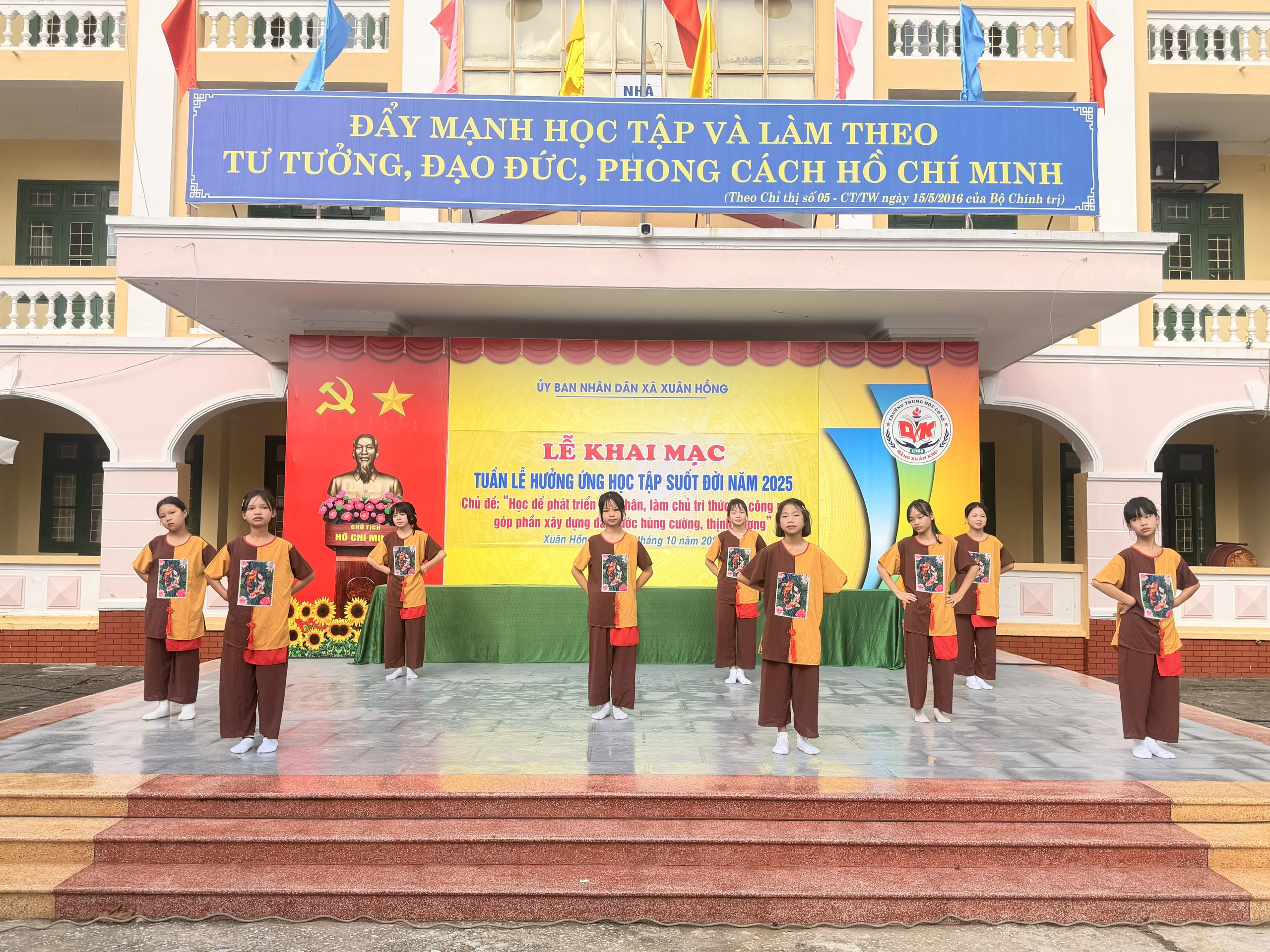 Sáng ngày 01/10/2025, tại Trường THCS Đặng Xuân Khu, UBND xã Xuân Hồng long trọng tổ chức Lễ khai mạc Tuần lễ hưởng ứng học tập suốt đời năm 2025 với chủ đề “Học để phát triển bản thân, làm chủ tri thức và công nghệ, góp phần xây dựng đất nước hùng cường, thịnh vượng”. Đây là một trong những sự kiện trọng tâm trong tháng 10, nhằm khẳng định tầm quan trọng của việc học tập thường xuyên, liên tục và suốt đời đối với mỗi người dân, đồng thời thể hiện quyết tâm của địa phương trong việc xây dựng “xã hội học tập” gắn với yêu cầu chuyển đổi số và hội nhập quốc tế.