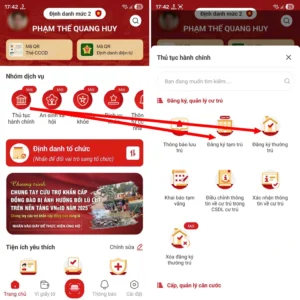– Kích hoạt và đăng nhập vào ứng dụng VNeID trên smartphone. Tại giao diện chính của ứng dụng, chọn “Thủ tục hành chính”, sau đó chọn “Đăng ký tạm trú” hoặc “Đăng ký thường trú” tại danh sách hiện ra.