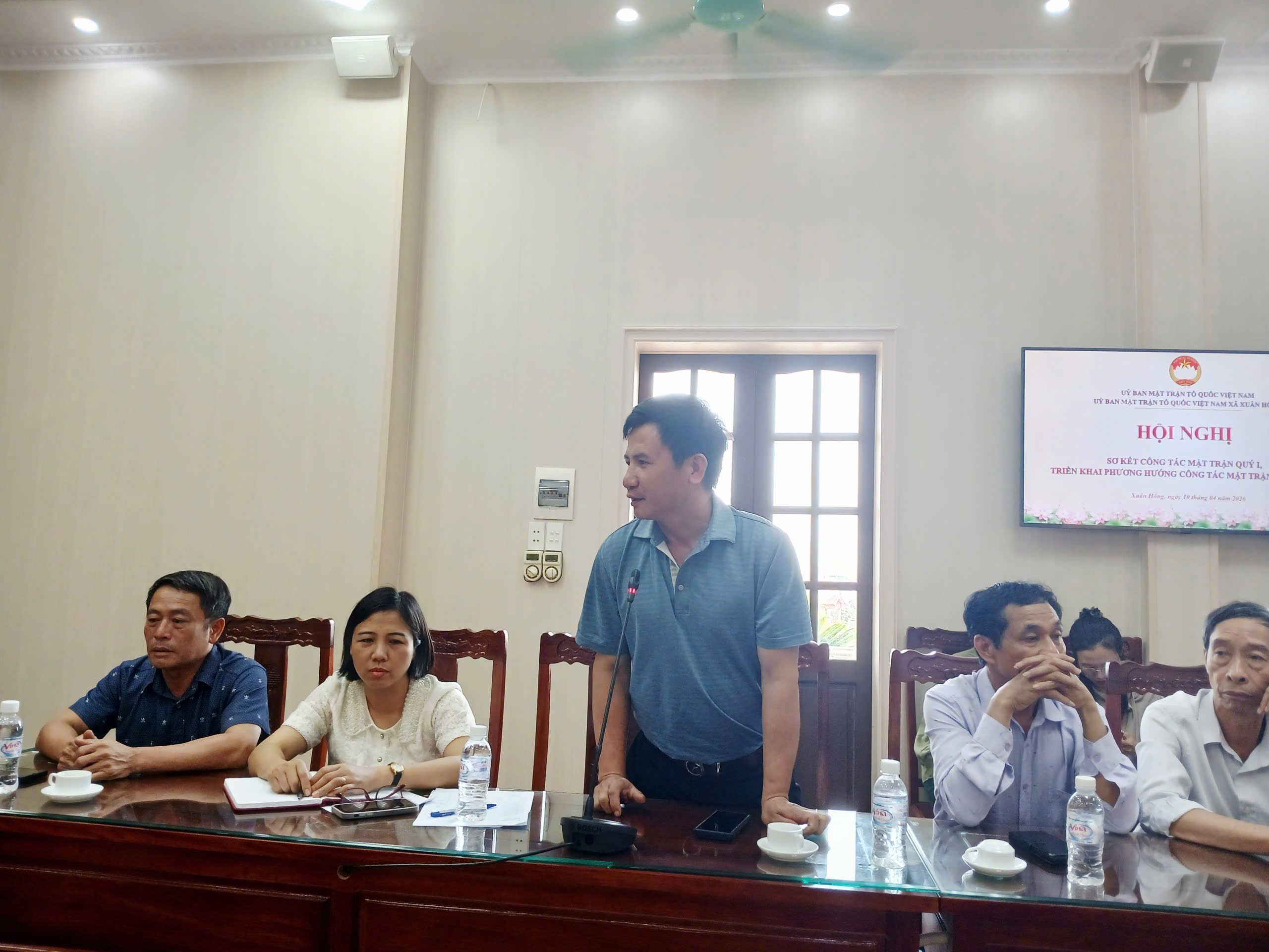 – Tại Hội nghị, đồng chí Nguyễn Xuân Hồng – Phó Chủ tịch Thường trực Ủy ban MTTQ xã đã báo cáo sơ kết công tác Mặt trận quý I với nội dung sâu sắc, toàn diện. Báo cáo khẳng định: dưới sự lãnh đạo trực tiếp của Đảng ủy xã, sự phối hợp chặt chẽ của HĐND, UBND và các tổ chức thành viên, hệ thống Mặt trận từ xã đến khu dân cư đã phát huy tốt vai trò nòng cốt trong việc củng cố, phát huy sức mạnh khối đại đoàn kết toàn dân tộc. Báo cáo nhấn mạnh những kết quả nổi bật trọng tâm cụ thể trên các lĩnh vực như: