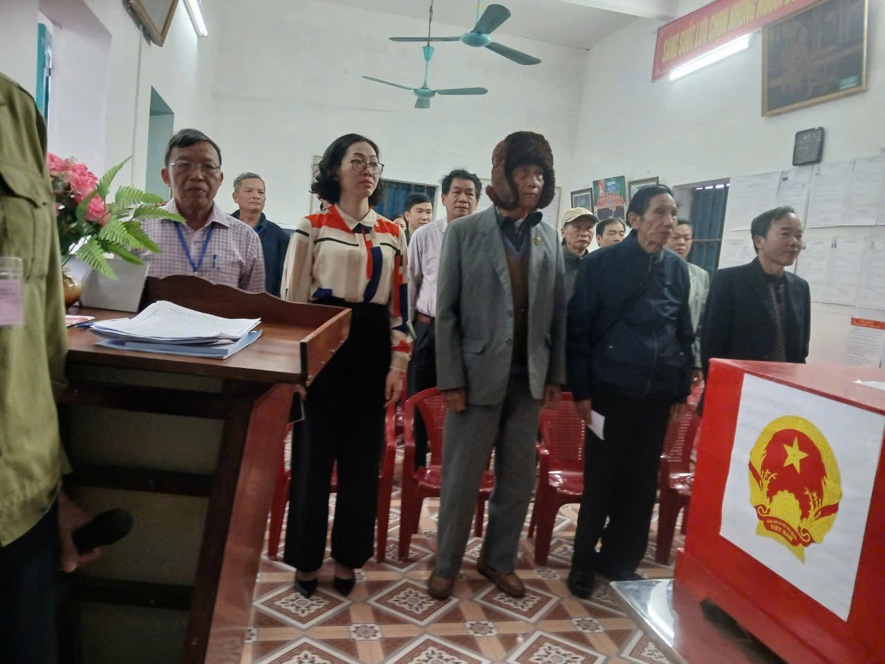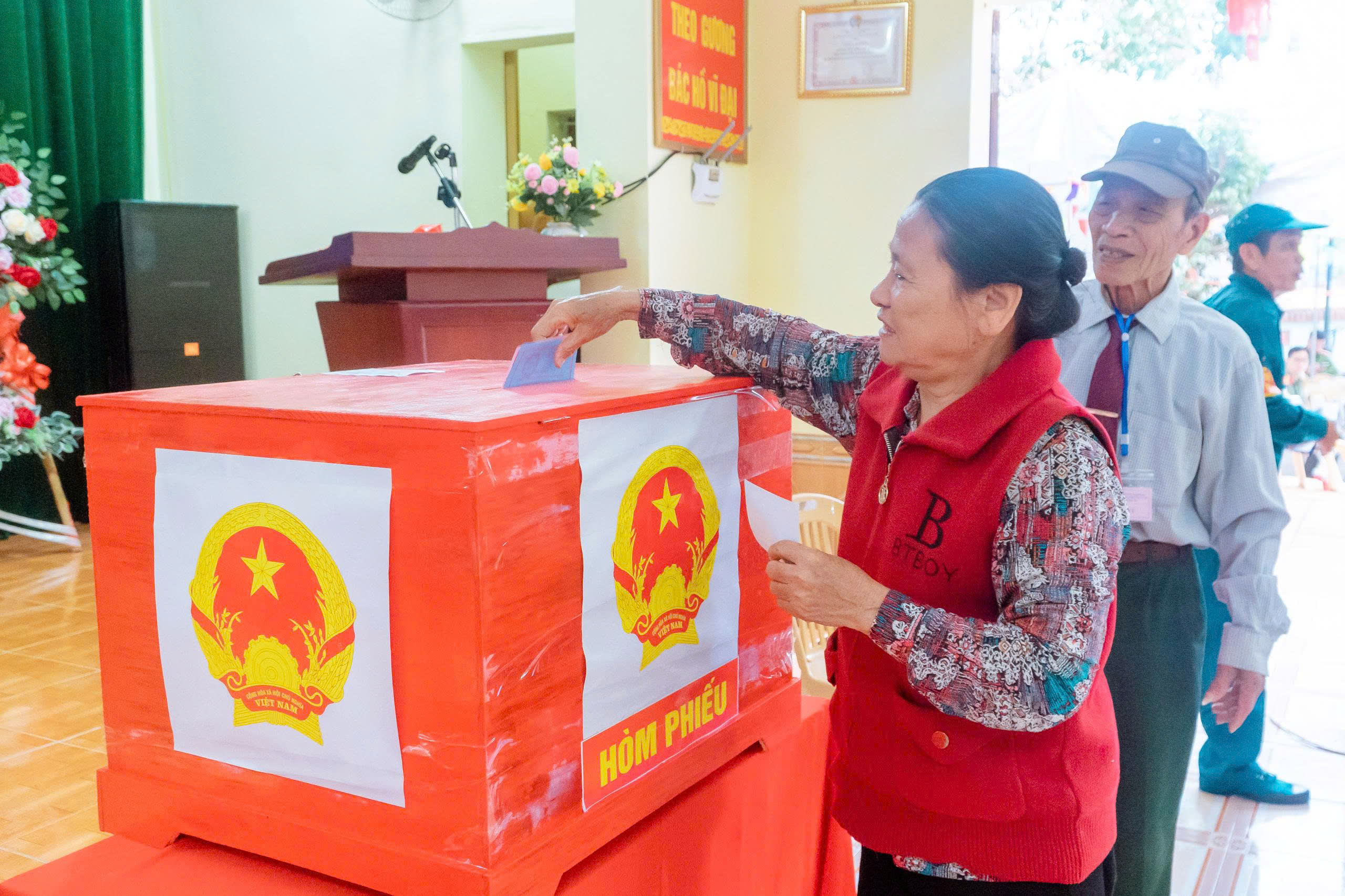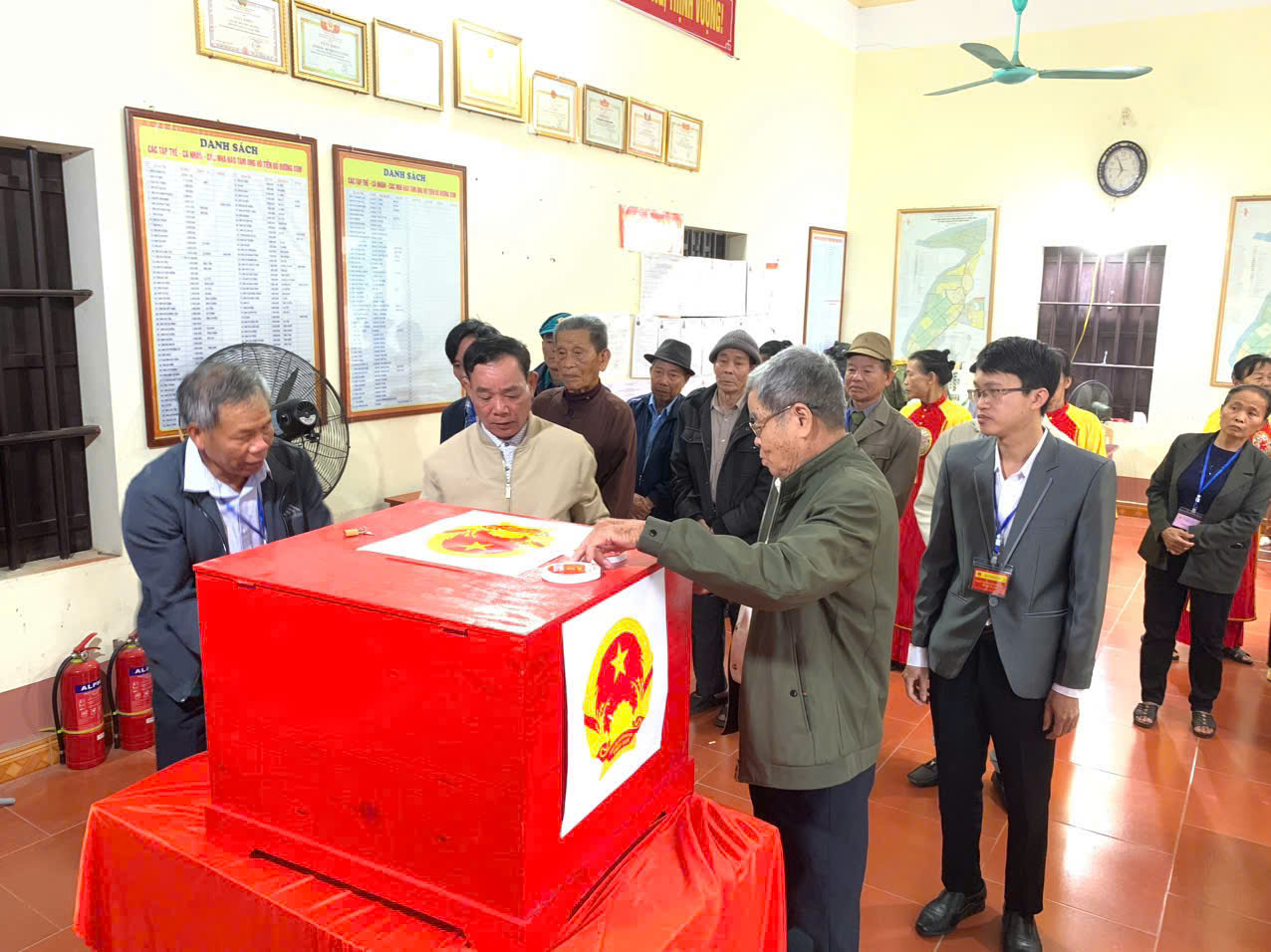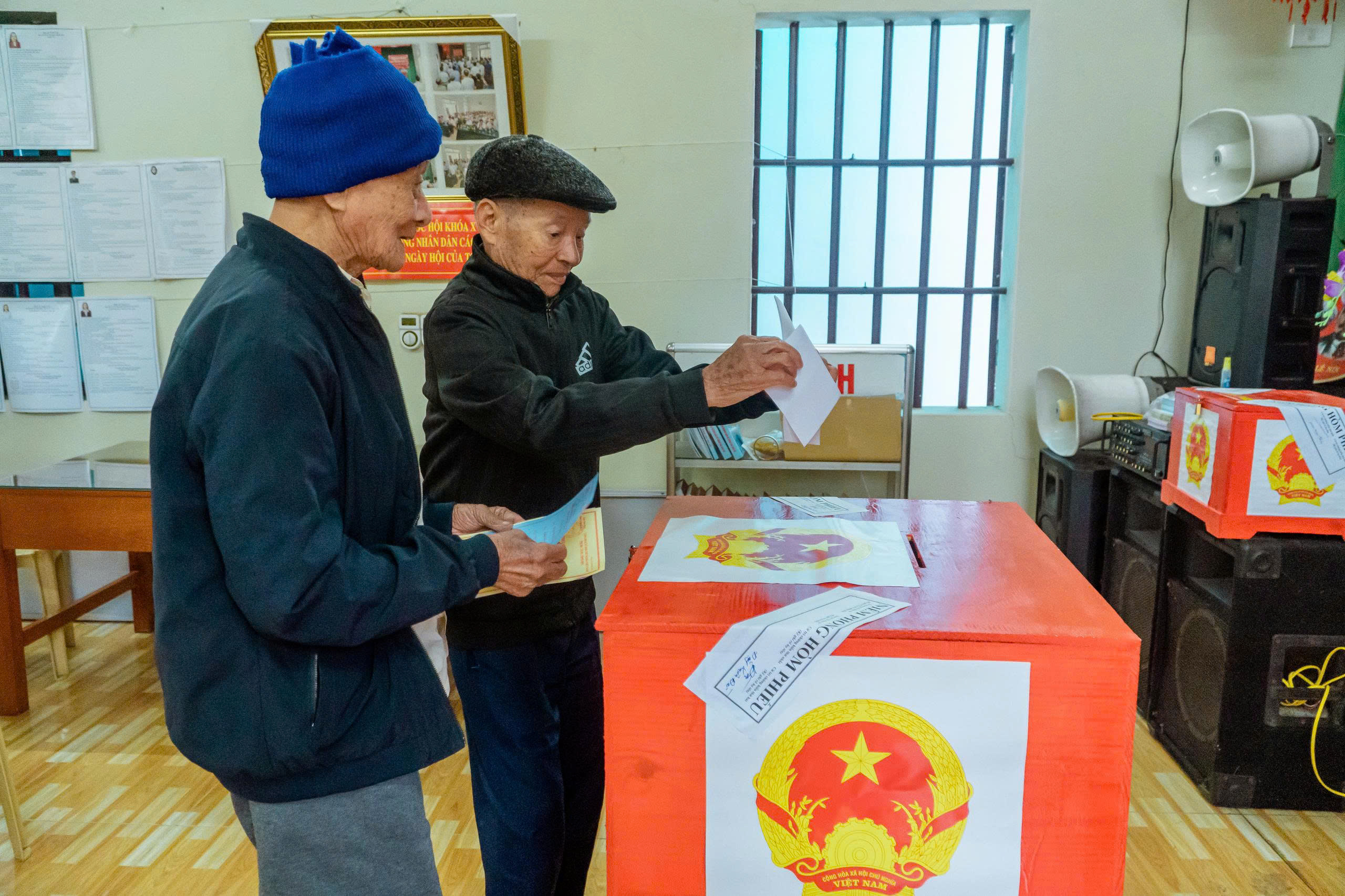 Ngay từ sáng sớm, tại tất cả các khu vực bỏ phiếu được tổ chức tại Nhà văn hóa các thôn xóm, từ các cụ ông, cụ bà cho đến các cử tri trẻ lần đầu tiên đi bỏ phiếu, ai ai cũng nô nức với lá phiếu trên tay đến các điểm bầu cử để thực hiện quyền và nghĩa vụ của mình, bầu ra những người tài đức để đại diện cho ý chí và nguyện vọng của nhân dân. Những cử tri cao tuổi nhất đã vinh dự được là người bỏ những lá phiếu đầu tiên vào hòm phiếu, kỳ vọng lá phiếu của mình sẽ chọn được những đại biểu Quốc hội, đại biểu Hội đồng nhân dân có bản lĩnh, trí tuệ, thực sự gắn bó với nhân dân hơn, gần dân hơn, để đưa đất nước ngày càng phát triển, làm cho đời sống vật chất, tinh thần của nhân dân ngày một nâng cao. Trong dòng cử tri đến bỏ phiếu từ sớm có nhiều cử tri trẻ lần đầu thực hiện quyền công dân đều bày tỏ niềm vinh dự, tự hào xen lẫn háo hức khi lần đầu tiên được tham gia bầu cử nên đã tìm hiểu kỹ thông tin các ứng cử viên, để lựa chọn người xứng đáng và hy vọng những đại biểu được bầu sẽ lắng nghe tiếng nói của người dân, đặc biệt là thế hệ trẻ. Không khí tại các điểm bỏ phiếu vừa nền nếp, trang trọng, vừa rộn ràng bởi dòng cử tri liên tục có mặt. Mỗi người đều thể hiện sự phấn khởi, nghiêm túc và trách nhiệm trong ngày hội lớn của đất nước. Các cử tri đóng dấu đã bỏ phiếu đúng quy trình.
